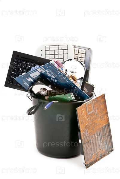 Детали от старого компьютера в мусорном ведре на белом фоне