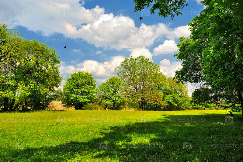 Тенистые деревья на зеленом лугу