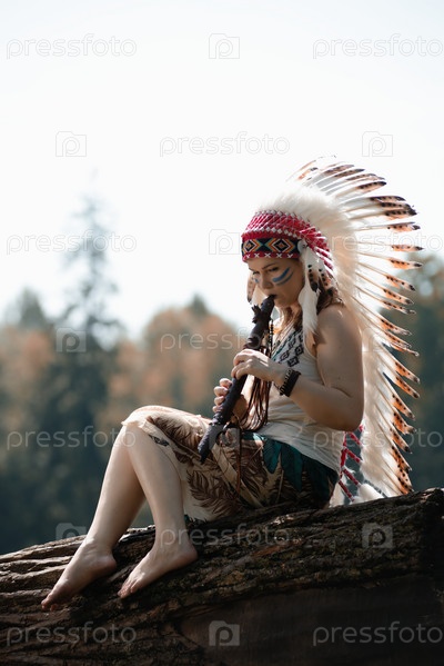 Девушка с флейтой в индейском головном уборе "руж"