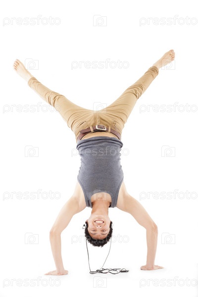 Молодой человек делает стойку на руках