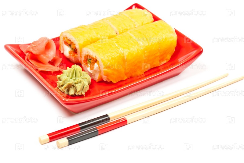 Желтые суши на тарелке и деревянные палочки на белом фоне