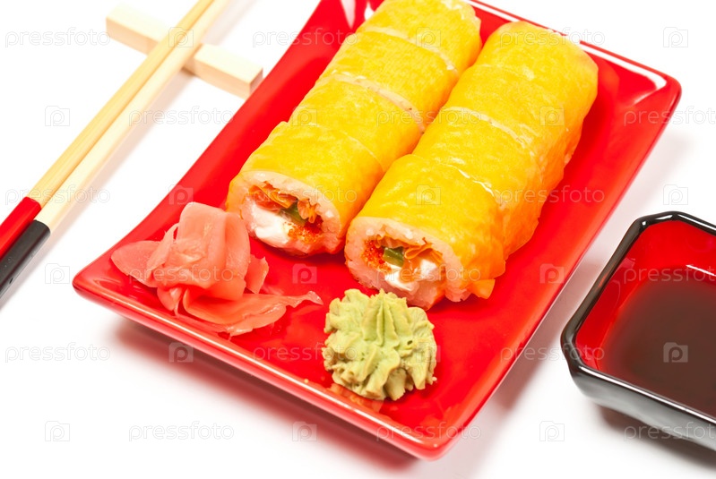 Желтые суши на тарелке и деревянные палочки на белом фоне