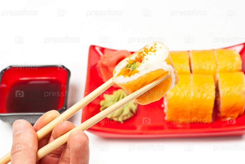 Мужская рука, берущая суши палочками на белом фоне