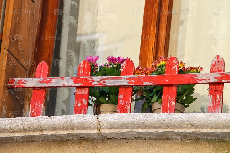 Цветы на окне за деревянным забором