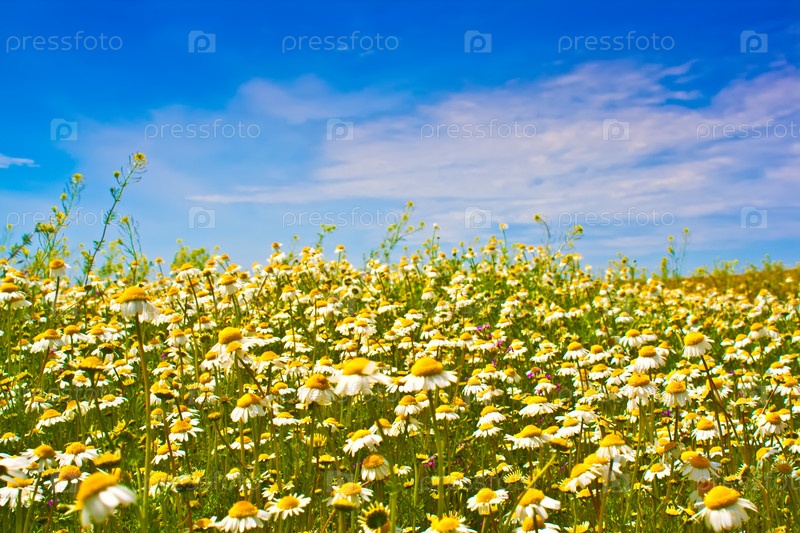 Красивое ромашковое поле на фоне синего неба