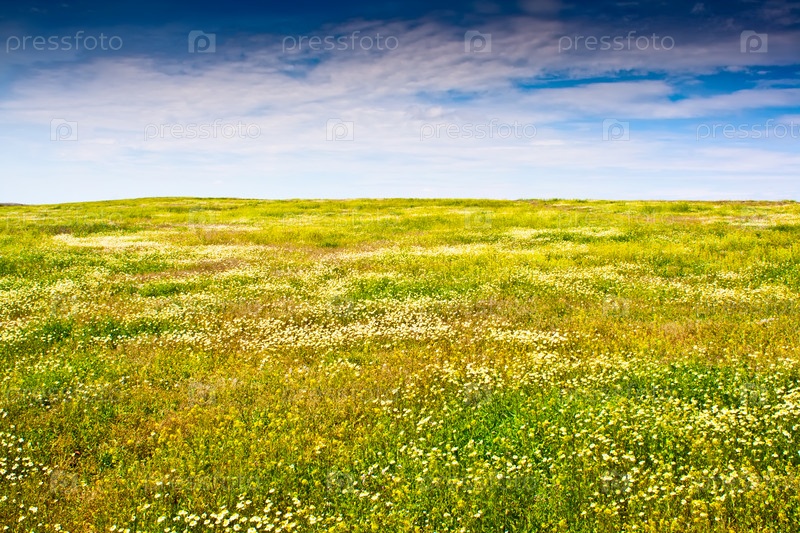 Красивое ромашковое поле под голубым небом