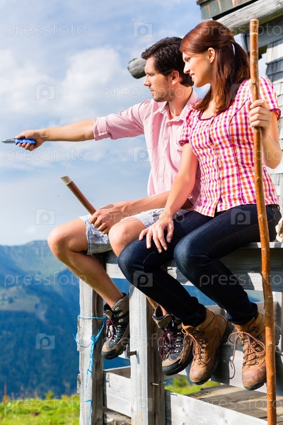 Мужчина и женщина сидят на веранде и смотрят на горы
