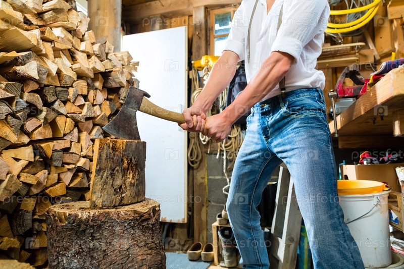 Мужчина колет дрова в горном шале