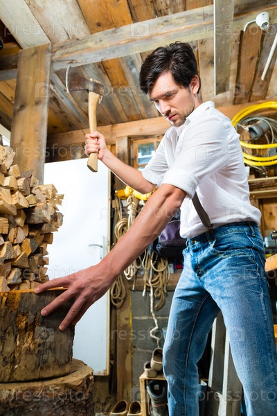 Мужчина колет дрова в горном шале