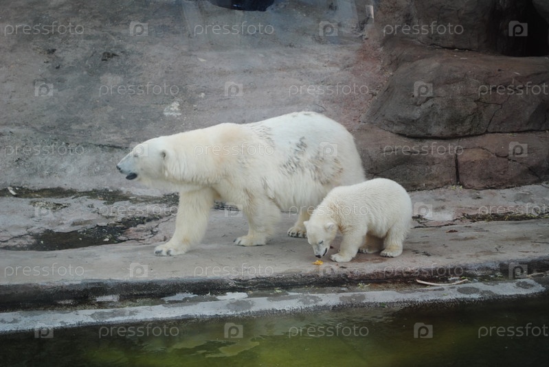 Белая медведица с малышом в зоопарке