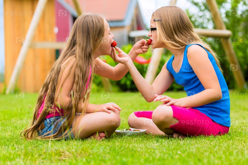 Сестры едят клубнику на поляне