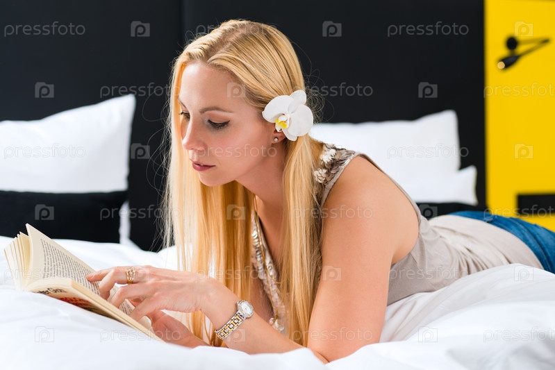 Молодая женщина читает книгу в постели