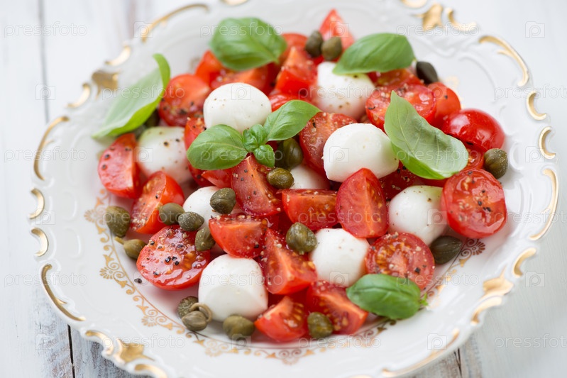 Салат с помидорами черри, моцареллой, каперсами и базиликом