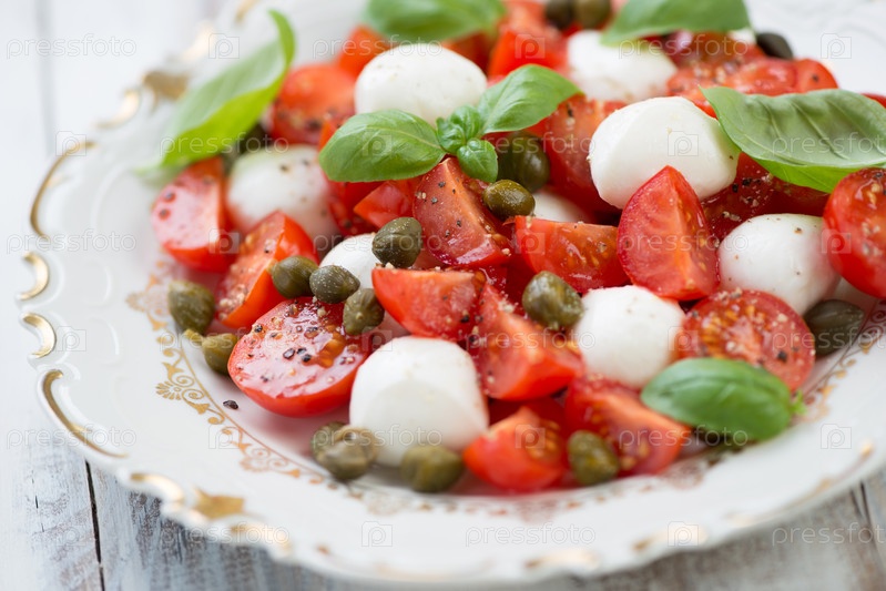 Салат с помидорами черри, моцареллой, каперсами и базиликом