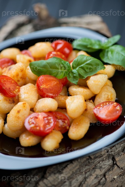 Жареные ньокки и красные помидоры черри с листьями зеленого базилика