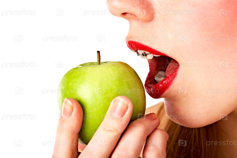 Молодая девушка в брекетах кусает свежее зеленое яблоко на белом фоне