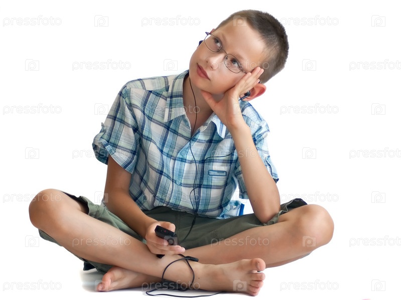 Мальчик слушает музыку в плеере и мечтает, сидя на белом фоне