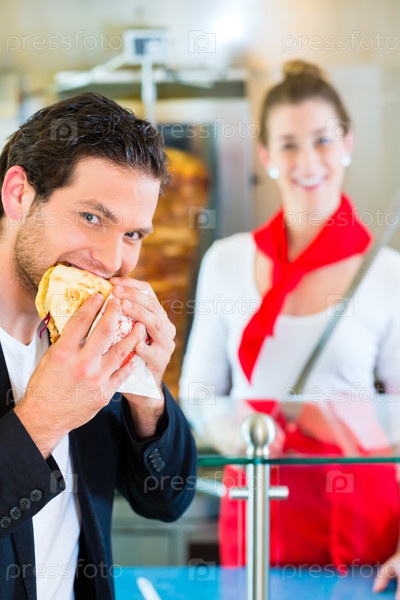 Клиент ест свежую шаурму в кафе