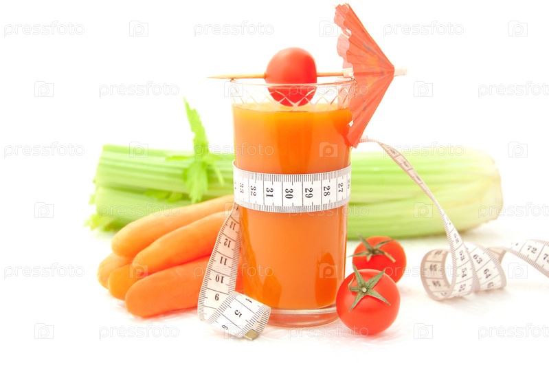 Овощи и стакан сока на белом фоне