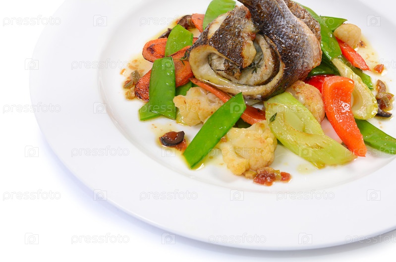 Филе сибаса с овощами и оливковым соусом