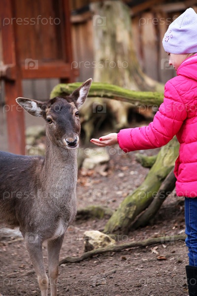 Девочка кормит оленя в зоопарке