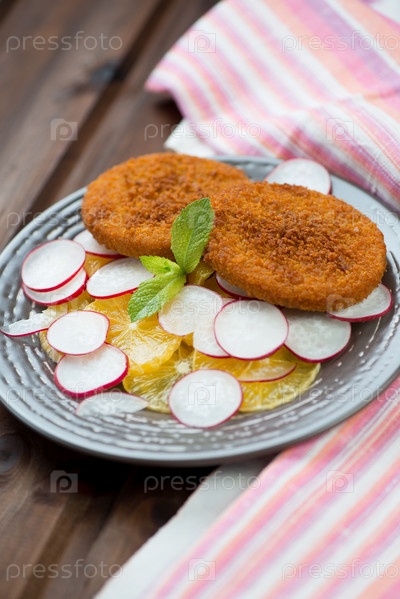 Жареные рыбные котлеты с апельсинами и редисом