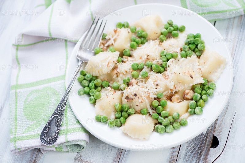 Равиоли, горох, грецкие орехи и сыр