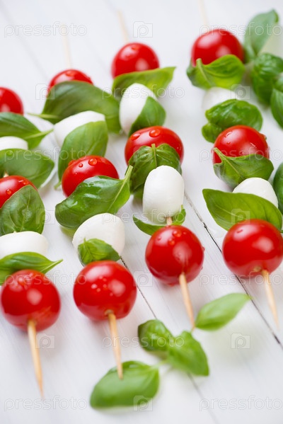 Шашлычки с шариками моцареллы, помидорами и листьями базилика
