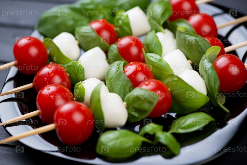 Шашлычки с шариками моцареллы, помидорами и листьями базилика