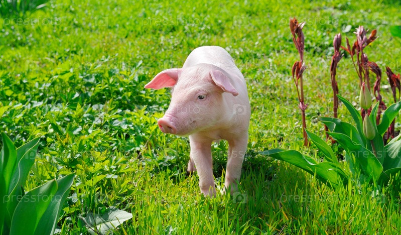 Поросенок на зеленой траве