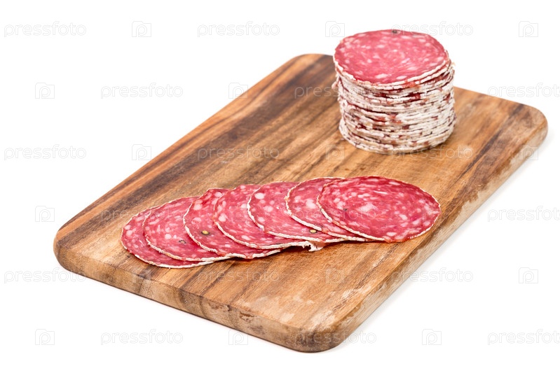 Ломтики салями на деревянной доске