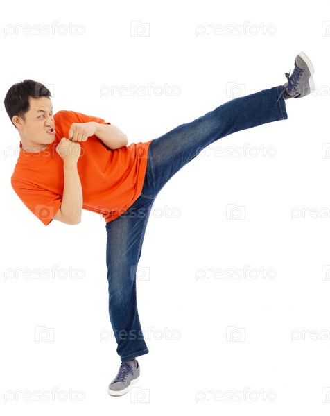Молодой мужчина наносит боковой удар ногой