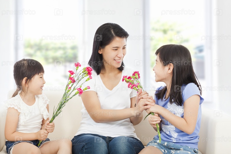 Две дочери вручают матери гвоздики