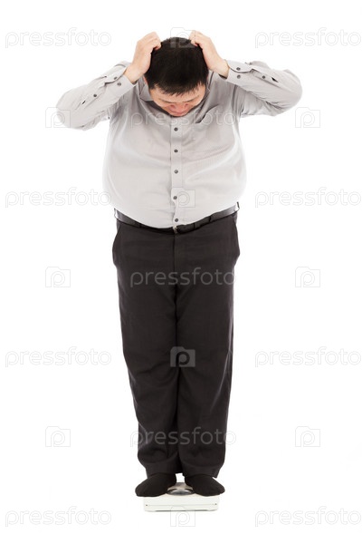 Толстый мужчина стоит на весах