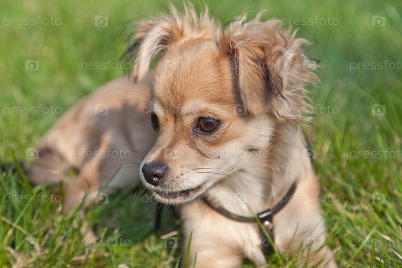 Маленький щенок лежит в траве