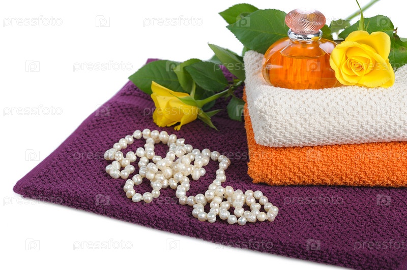 Желтый флакон духов, розы, бусы и полотенца, на белом фоне
