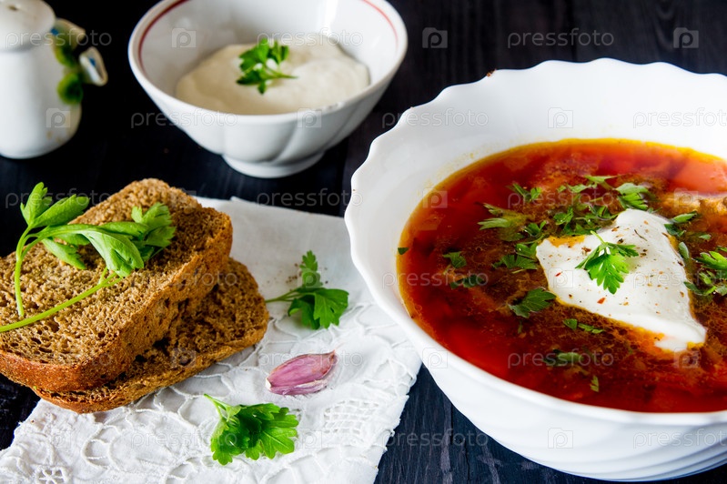 Тарелка борща со сметаной и травами