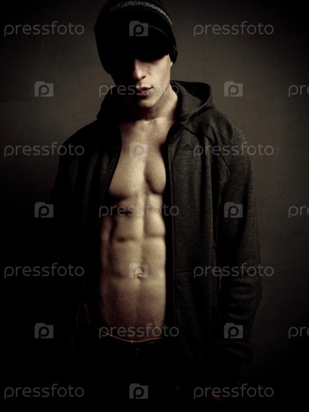 Мужчина с мускулистым прессом на темном фоне