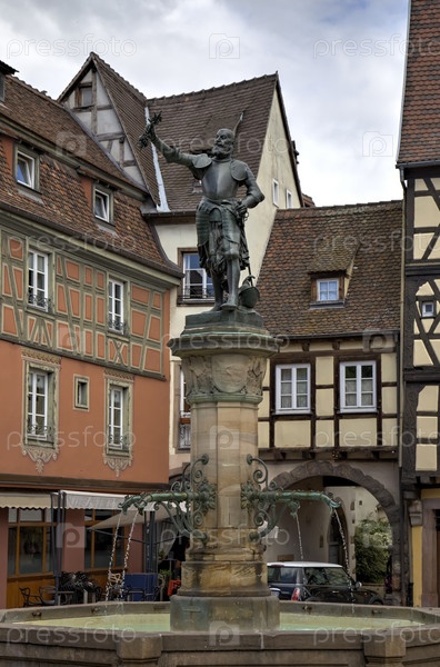 Фонтан со статуей Лазаря де Швенди на фоне фахверковых домов. Кольмар, Франция