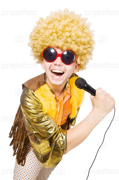 Мужчина в парике с микрофоном