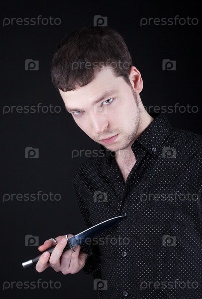 Портрет депрессивного человека с ножом на черном фоне