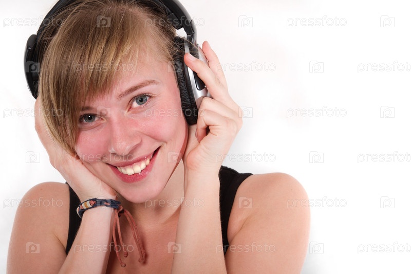 Молодая счастливая девушка в наушниках на белом фоне