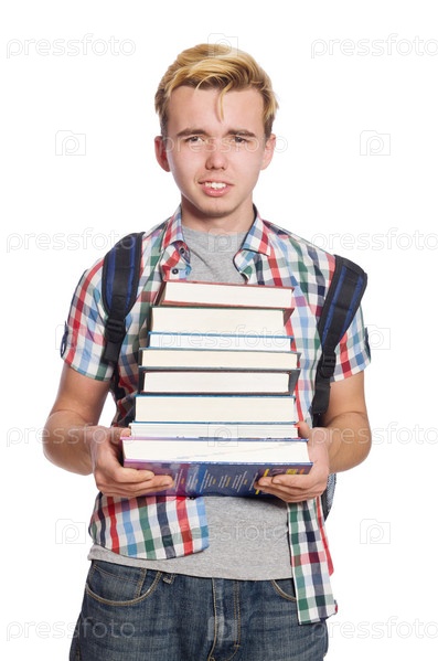 Смешной студент со стопкой книг