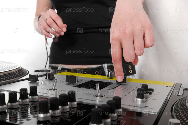 Женские руки на музыкальной аппаратуре на белом фоне