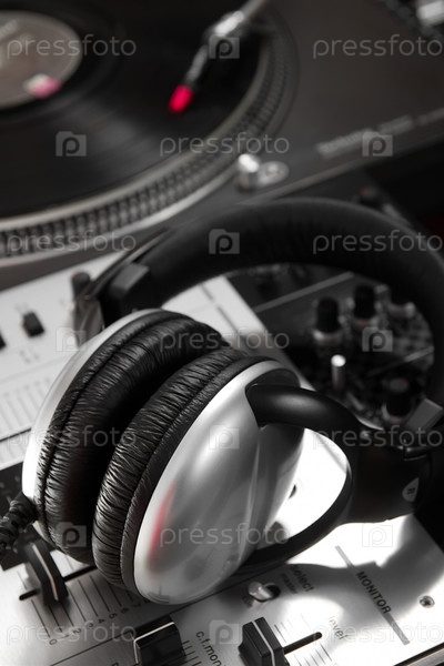 Наушники, лежащие на музыкальной аппаратуре на белом фоне