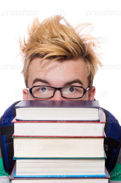 Смешной студент со стопкой книг
