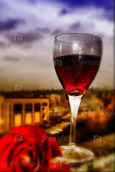 Бокал вина и роза на фоне города