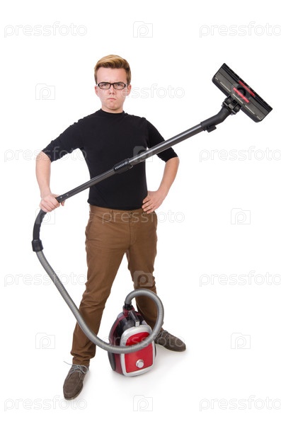 Забавный человек с пылесосом