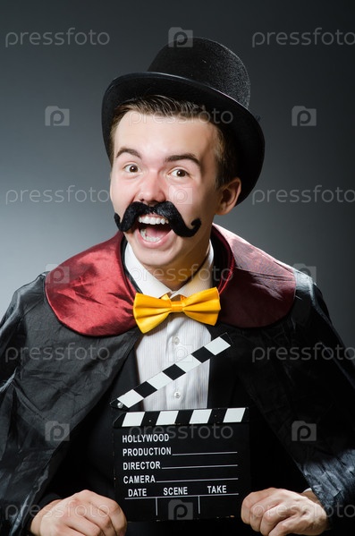 Забавный мужчина с кинохлопушкой