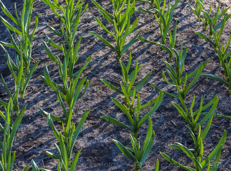 Стройные зеленые всходы чеснока на грядке